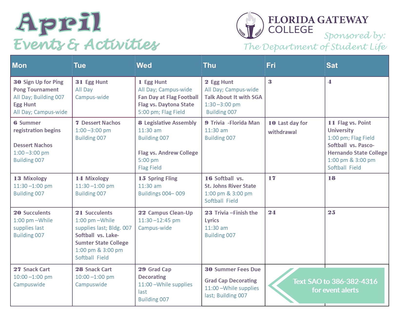 Florida Gateway College offers a variety of activities and events to keep students engaged and connected. We pride ourselves in making each of our students feel at home. From games in the student center to career fairs and cultural events, there is always something to do at FGC. So, experience FGC beyond the classroom. Get involved. Have some fun. Become a leader. Opportunities abound.
